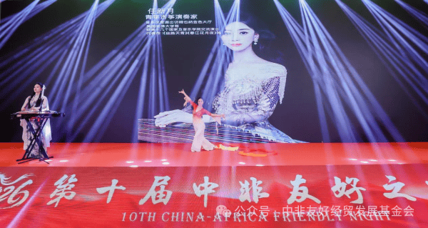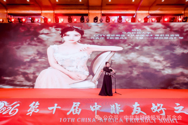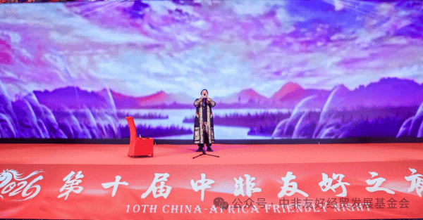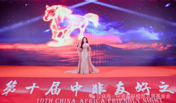 张仪理事长将“中非友好贡献奖”奖杯授予塞拉利昂的玛丽亚(黑珍珠)女士。作为非洲友邦的杰出代表,玛丽亚女士长期致力于推动非中友好合作,在人文交流、民间外交中架起“连心桥”。展现了中非命运与共的深厚情谊,堪称“中非友好的使者”。同时张仪理事长将“中非友好形象大使”、“中非文化传播大使”分别授予(演员、歌手、画家)王亚楠女士和演员成超越女士,以表彰他们在推广中非文化、促进民心相通中的创新实践。 2.视听盛宴:艺术交融,奏响友谊乐章 一场融合中非文化元素的视听盛宴精彩纷呈。 文艺表演由“中非文化传播大使”-成超越(演员)主持,特邀2007年《星光大道》周冠军、月冠军及年度总决赛第四名,2009年世界小姐双料冠军’深受中国人民喜爱的玛丽亚女士,亲自率领一支热情洋溢的非洲舞蹈团闪亮登场。她们身着五彩斑斓的传统服饰,踏着欢快的鼓点,用充满原始生命力的舞姿演绎了,一首首耳熟能详的经典歌曲--说唱脸谱、谢谢你中国等等。引发了全场观众的强烈共鸣,歌声中既有东方温婉,也有非洲奔放。将现场气氛瞬间点燃,推向了最高潮。“中非友好形象大使”王亚楠(演员、歌手、画家)演唱歌曲《马不停蹄》,为在场嘉宾献上了马年祝福。在场的艺术家们为第十届中非友好之夜呈现出一场令人难忘的视听盛宴。